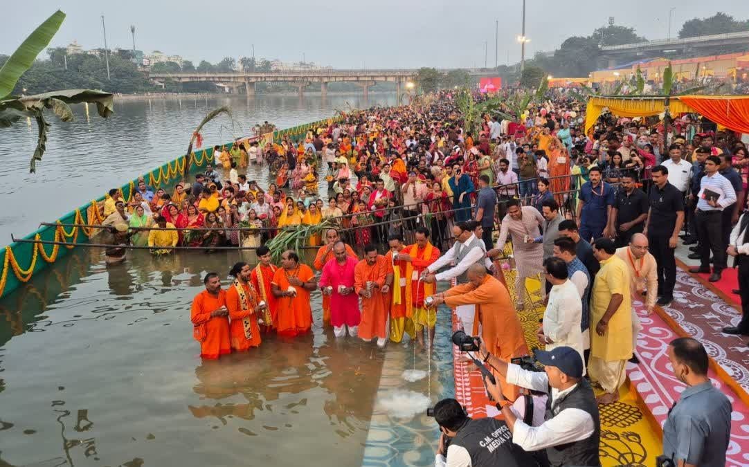 छठ पूजा में शामिल हुए सीएम योगी, डूबते सूर्य को दिया अर्घ्य