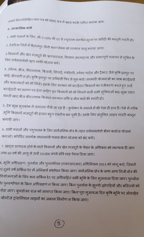 देवरिया। उत्तर प्रदेश के देवरिया जिले में किसान नेता भाजपा की कृषि नीतियों के खिलाफ बुधवार को जमकर बरसे। उन्होंने कहा, इस लोकसभा चुनाव में भाजपा को 159 सीटों पर किसानों ने हराया है। अगर केंद्र सरकार ने अपनी कृषि नीति नहीं बदली तो फिर हारेगी। किसान नेताओं ने कहा- भाजपा को यह समझना चाहिए कि सत्तारूढ़ गठबंधन को 5 राज्यों में 38 ग्रामीण लोकसभा सीटों पर हार का सामना करना पड़ा है, जहां किसान आंदोलन मजबूत था। यह लंबे चले आ रहे कृषि संकट का परिणाम है। देवरिया के कई सामाजिक समूहों ने मिलकर सलेमपुर सांसद रमाशंकर राजभर को 14 सूत्रीय तात्कालिक और 8 सूत्रीय नीतिगत मांगों को लेकर ज्ञापन सौंपा। इन समूहों में संयुक्त किसान मोर्चा देवरिया, अखिल भारतीय किसान सभा, उ.प्र.किसान सभा, चीनी मिल चलाओ संघर्ष समिति, भारतीय किसान यूनियन, क्रांतिकारी किसान सभा, खेत मजदूर-किसान मंच, समान शिक्षा आंदोलन, उत्तर प्रद्रेश शामिल थे। इस दौरान वक्ताओं ने सांसद राजभर को से कहा कि किसानों और खेत मजदूरों के पक्ष में खड़े रहकर प्रधानमंत्री और मंत्रिमंडल पर लंबित मांगों पर तत्काल और सार्थक कार्रवाई करने का दबाव डालें। किसानों ने कहा कि – NDA-2 सरकार को SKM और केन्द्र सरकार के बीच 9 दिसंबर 2021 को हुए समझौते के उल्लंघन के लिए जिम्मेदार ठहराया गया, जिसमें हमारी लंबे समय से लंबित मांग जैसे कि लाभकारी और गारंटीकृत एमएसपी के साथ खरीद, व्यापक ऋण माफी, बिजली के निजीकरण को निरस्त करना आदि शामिल हैं।”