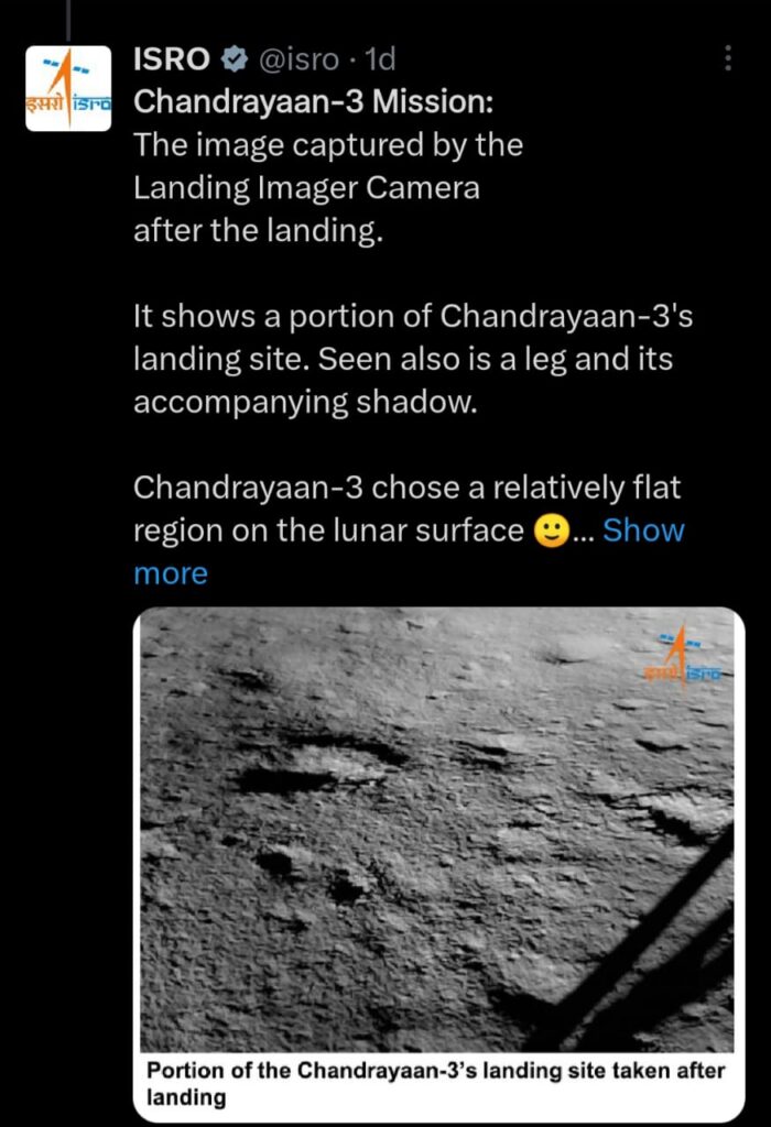 सफलतापूर्वक लैंडिंग के बाद लैंडर ने चंद्रमा से तस्वीरें भेजी, जिसे इसरो ने ट्विटर पर साझा किया और लिखा-“नीचे उतरते समय ली गई लैंडर हॉरिजॉन्टल वेलोसिटी कैमरे की तस्वीरें यहां दी गई हैं। एक और तस्वीर शेयर कर इसरो ने तस्वीर के बारे में बताया कि लैंडिंग के बाद लैंडिंग इमेजर कैमरे से ली गई तस्वीर, इसमें चंद्रयान-3 की लैंडिंग साइट का एक हिस्सा दिखाया गया है। एक पैर और उसके साथ की परछाई भी दिखाई दे रही है। चंद्रयान-3 ने चंद्रमा की सतह पर अपेक्षाकृत समतल क्षेत्र चुना है।
