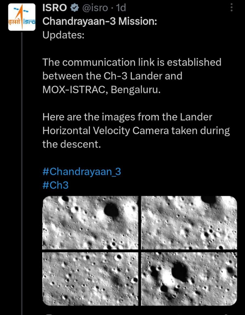 चंद्रयान के लैंडर के सफलता पूर्वक लैंडिंग के कुछ समय बाद ही इसरो ने चंद्रयान-3 और MOX-ISTRAC, बेंगलुरुके बीच कम्युनिकेशन लिंग स्थापित होने की खबर ट्विटर पर शेयर की ।इसरो के मिशन में ISTRAC औरMOX महत्वपूर्ण भूमिका निभा रहे हैं। साथ ही एक और ट्विट में इसरो की तरफ से लैंडर के द्वारा ली गई ताजा तस्वीरें भी शेयर की गई हैं।ISTRAC और MOX मिशन की ट्रैकिंग और पल-पल की निगरानी करने में मदद करते हैं।