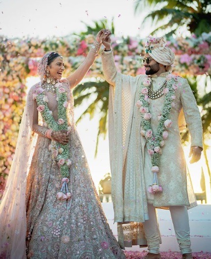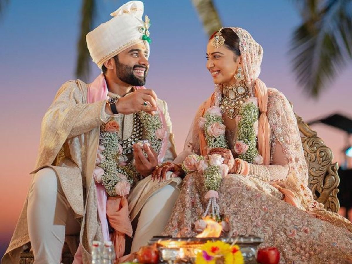 कपल ने अपने इस खास दिन के लिए पिंक कलर का आउटफट चुना था। हल्के पिंक लहंगे में फूलों की एम्ब्रॉयडरी वाले लहंगे में रकुल बेहद खूबसूत लग रही थी। रकुल ने अपने लहंगे के साथ मैच करता हुआ पिंक चूड़ा भी पहना था। जैकी ने भी रकुल से मैच करता हुआ पिंक शेरवानी पहनी थी साथ में रकुल की ज्वेलरी से मैच करती हुई ग्रीन स्टोन की कलगी अपनी पगड़ी पर लगाई हुई थी। शादी की रस्में होती ही न्यूली वेड कपल ने मीडिया से मुलाकात की और उनकी बधाइयां ली।