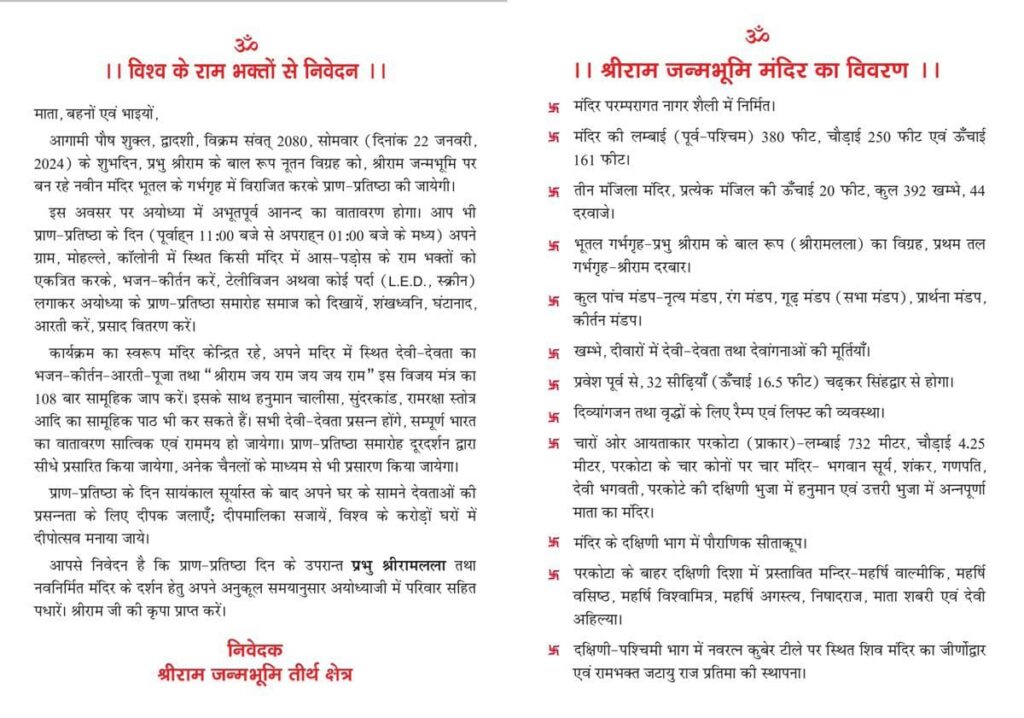एक्स अकाउंट पर लिखी अपील के साथ एक और पत्रक है, जिसमें राम मंदिर के निर्माण से जुड़ी खासियत का ब्योरा दिया गया है जो इस प्रकार है-
